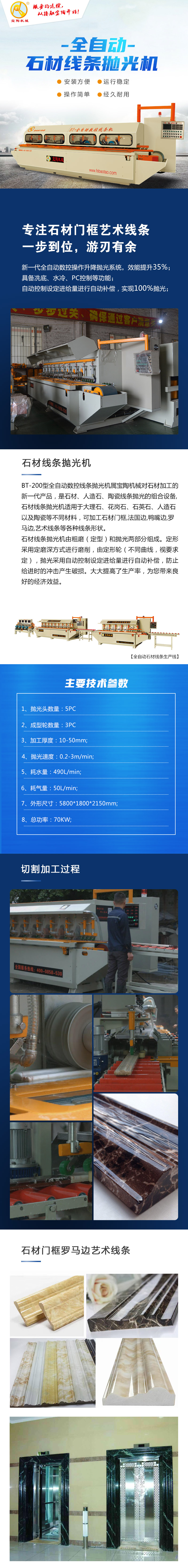 BT-200型全自動(dòng)數(shù)控線條拋光機(jī)屬寶陶機(jī)械對(duì)石材加工的新一代產(chǎn)品,是石材、人造石、陶瓷線條拋光的組合設(shè)備,石材線條拋光機(jī)適用于大理石、花崗石、石英石、人造石以及陶瓷等不同材料,可加工石材門(mén)框,法國(guó)邊,鴨嘴邊,羅馬邊,藝術(shù)線條等各種線條形狀。