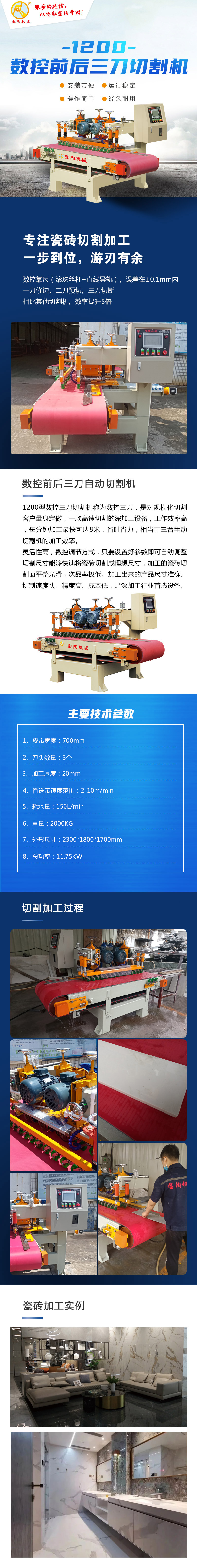 1200型數(shù)控前后三組刀切割機(jī)俗稱為數(shù)控三組刀,是對規(guī)?;懈羁蛻袅可矶ㄗ?,一款高速切割的深加工設(shè)備。最大可切割1.2米(1.2米瓷磚可對開成1200*600mm);有輸送帶流水線式自動(dòng)批量切割,切割速度快;采用數(shù)控調(diào)節(jié)尺寸,精度高,誤差在0.1mm以內(nèi);采用三刀頭結(jié)構(gòu),不崩邊,切割帶修邊一次性過,直接切割出原廠邊效果,無需二次加工,更省事;效率是手推切割機(jī)的4倍。適合大批量瓷磚切割加工。