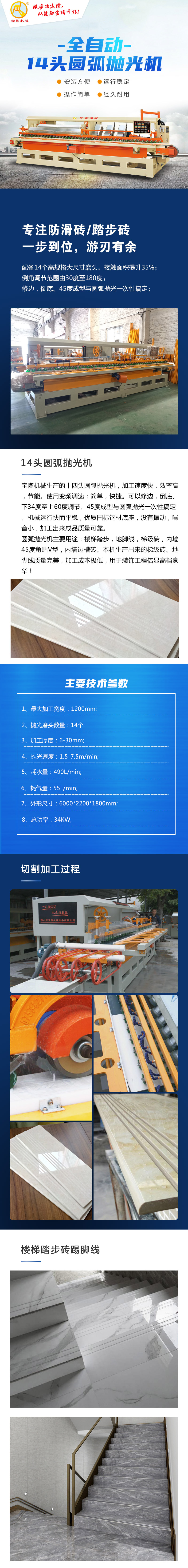 拋光磨頭可手動(dòng)、自動(dòng)控制,變頻調(diào)速,氣動(dòng)壓輪,采用進(jìn)口軸承,進(jìn)口品牌電器元件,不銹鋼螺絲。由于機(jī)械功能齊全,操作方便,專業(yè)加工拋光樓梯踏步、地腳線、45度斜邊等。運(yùn)行平穩(wěn)、振動(dòng)小、噪音低、加工速度快、加工成本極低,整機(jī)設(shè)計(jì)美觀大方,受到廣大客戶一致好評(píng)!