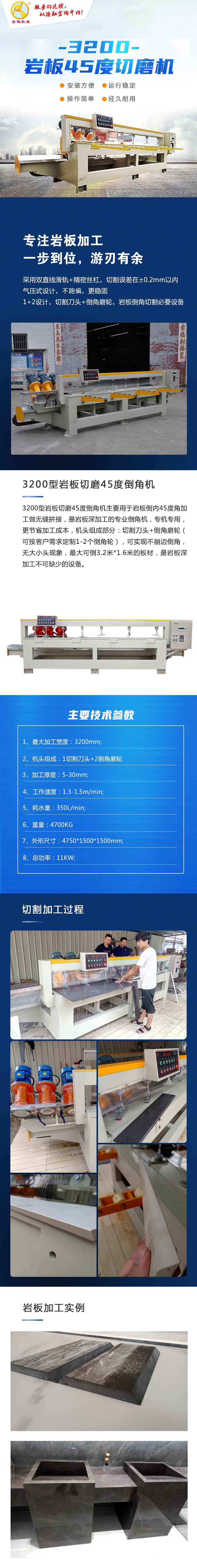 3200型巖板切磨45度倒角機(jī)主要用于巖板倒內(nèi)45度角加工做無縫拼接,是巖板深加工的專業(yè)倒角機(jī),專機(jī)專用,更節(jié)省加工成本,機(jī)頭組成部分:1個(gè)切割刀頭+2個(gè)倒角磨輪,可實(shí)現(xiàn)不崩邊倒角,無大小頭現(xiàn)象,最大可倒3.2米*1.6米的板材,是巖板深加工不可缺少的設(shè)備。