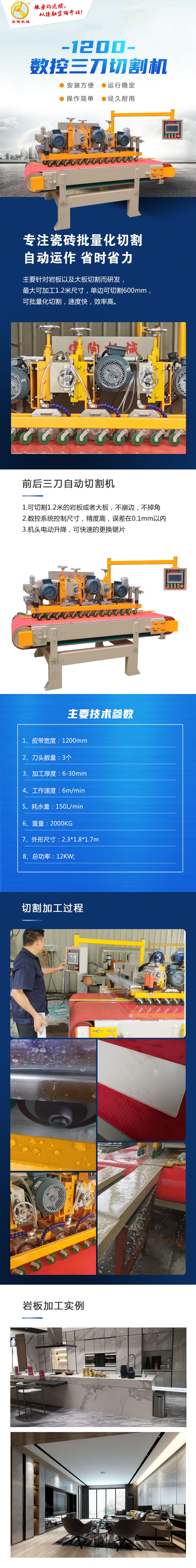 1200型巖板數(shù)控三刀切割機主要針對巖板以及大板切割而研發(fā),最大可加工1.2米尺寸,單邊可切割600mm,可批量化切割,速度快,效率高。1.可切割1.2米的巖板或者大板,不崩邊,不掉角2.數(shù)控系統(tǒng)控制尺寸,精度高,誤差在0.1mm以內(nèi)3.機頭電動升降,可快速的更換鋸片