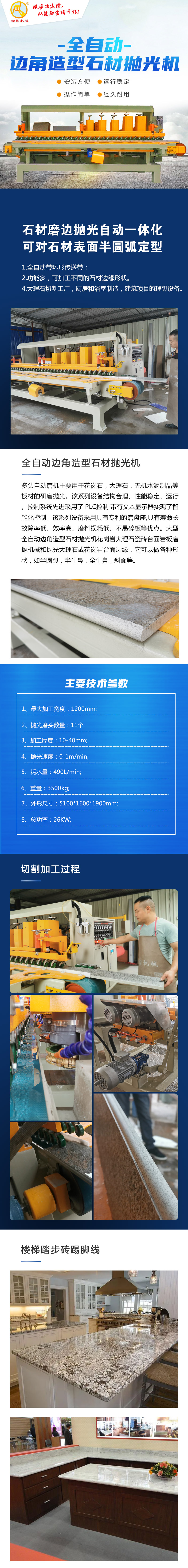多頭自動(dòng)磨機(jī)主要用于花崗石,大理石,無(wú)機(jī)水泥制品等板材的研磨拋光。該系列設(shè)備結(jié)構(gòu)合理、性能穩(wěn)定、運(yùn)行??刂葡到y(tǒng)先進(jìn)采用了 PLC控制 帶有文本顯示器實(shí)現(xiàn)了智能化控制。該系列設(shè)備采用具有專利的磨盤(pán)座,具有壽命長(zhǎng)故障率低、效率高、磨料損耗低、不易碎板等優(yōu)點(diǎn)。大型全自動(dòng)邊角造型石材拋光機(jī)花崗巖大理石瓷磚臺(tái)面巖板磨拋機(jī)械和拋光大理石或花崗巖臺(tái)面邊緣,它可以做各種形狀,如半圓弧,半牛鼻,全牛鼻,斜面等